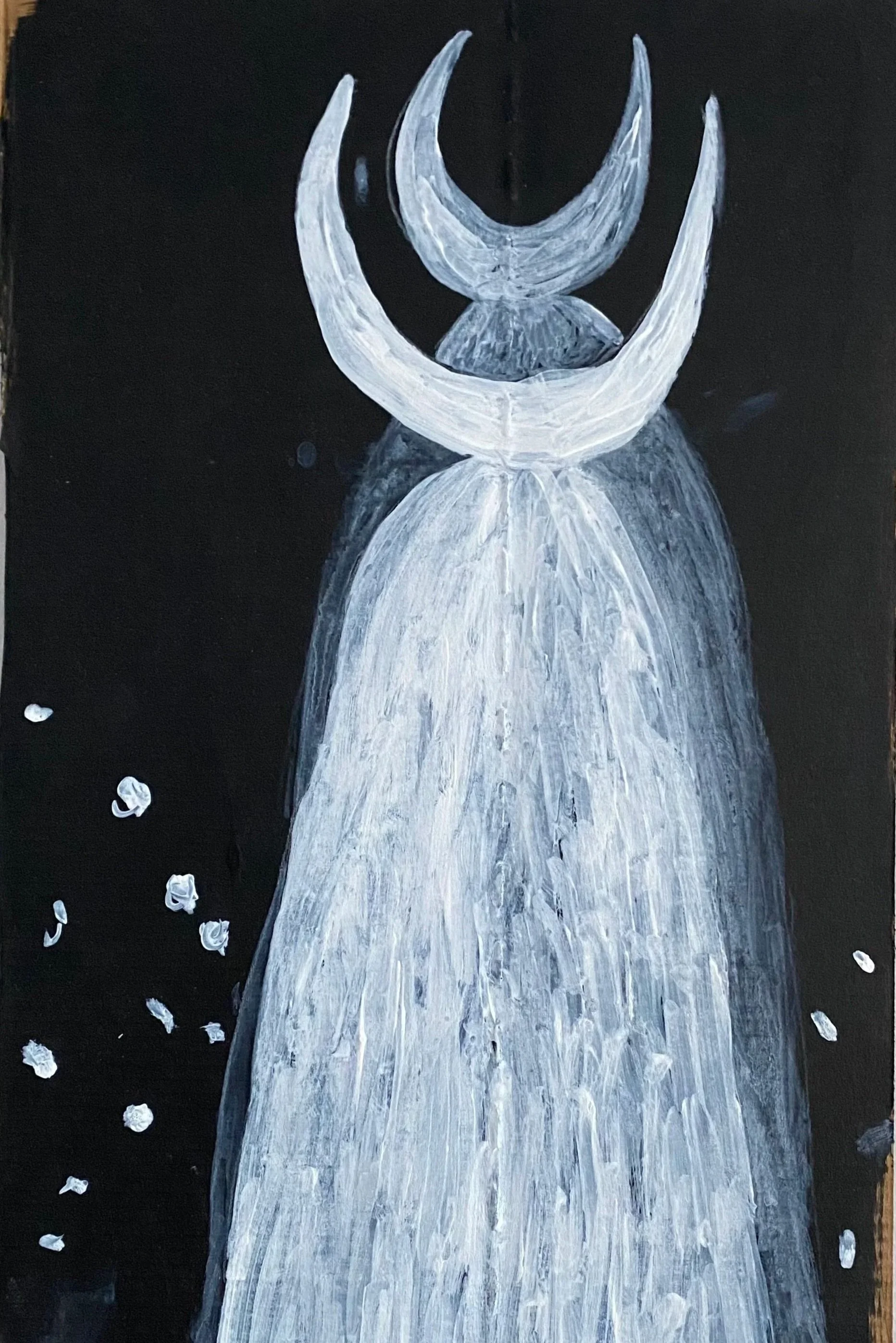 “Mother is a Landscape” explores the profound experience of having a mother, depicting her as a changeling with immense power. The painting traces a pre-dawn journey through a rugged landscape to a sea platform, capturing the forms and energy of seeing a mother through a child’s eyes.