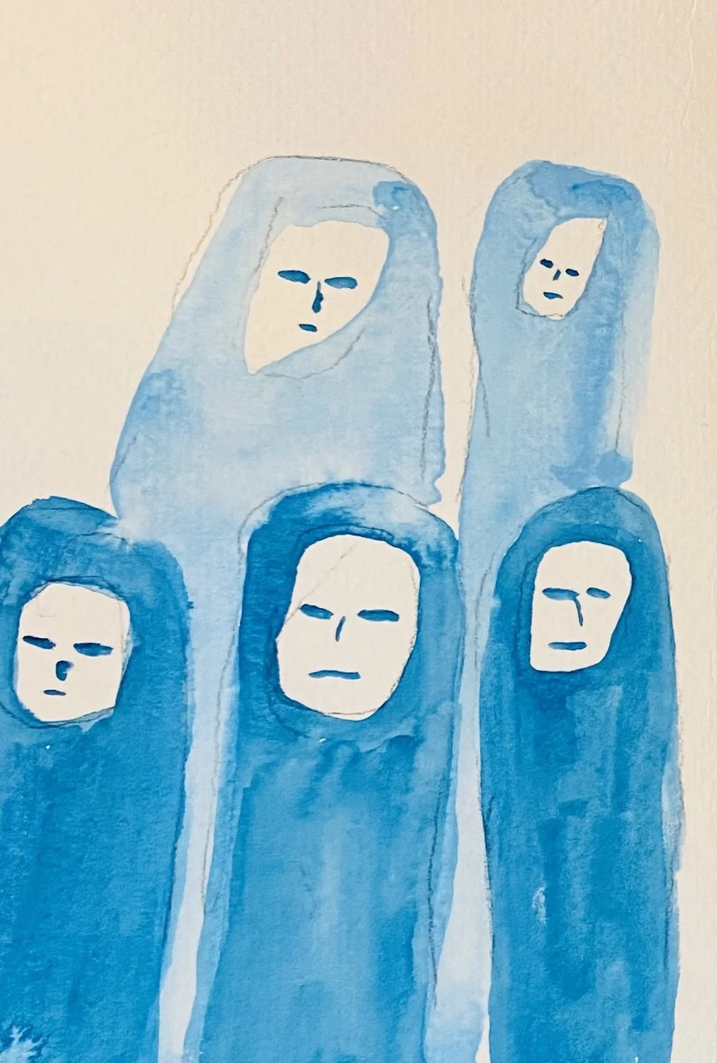“We Are Breaking Spells”, brings into existence a woman’s dissolving presence. Erased from institutional history and from her own memory, her body is witnessed through the sound of her trembling hands playing an oddly familiar song, her voice rising in an invitation to sing. Initially, the watercolour paintings depict women as simple shapes. This anonymity is gradually disrupted by an internal force, revealed through changes in detail, gaze, and physically defiant posture. “We” invites the viewer to recognise their role in bringing the unseen women into presence, breaking the spell of invisibility.